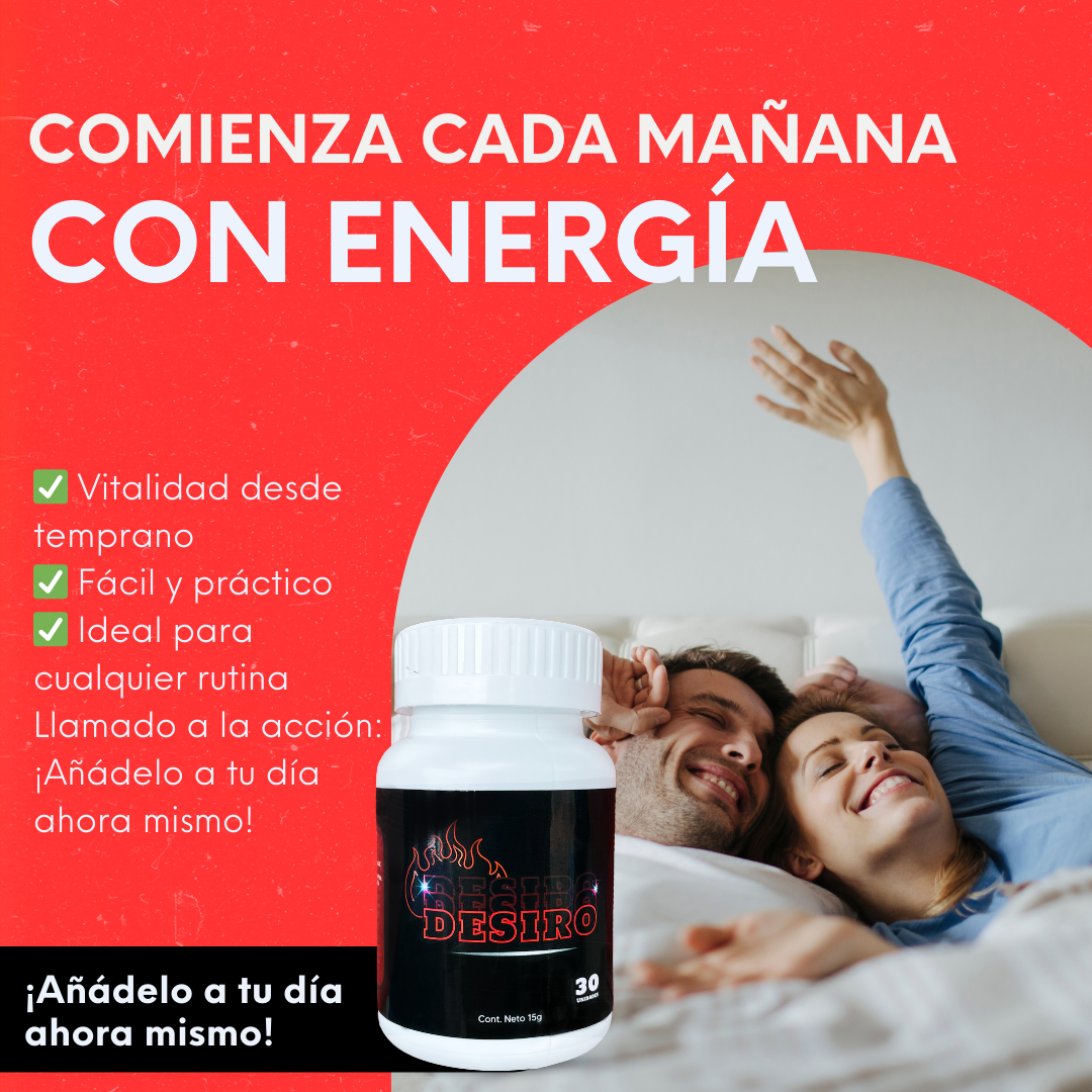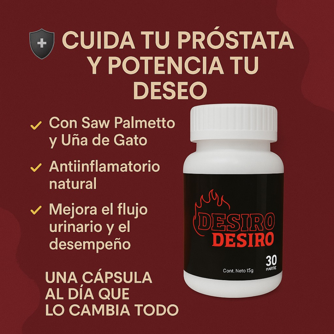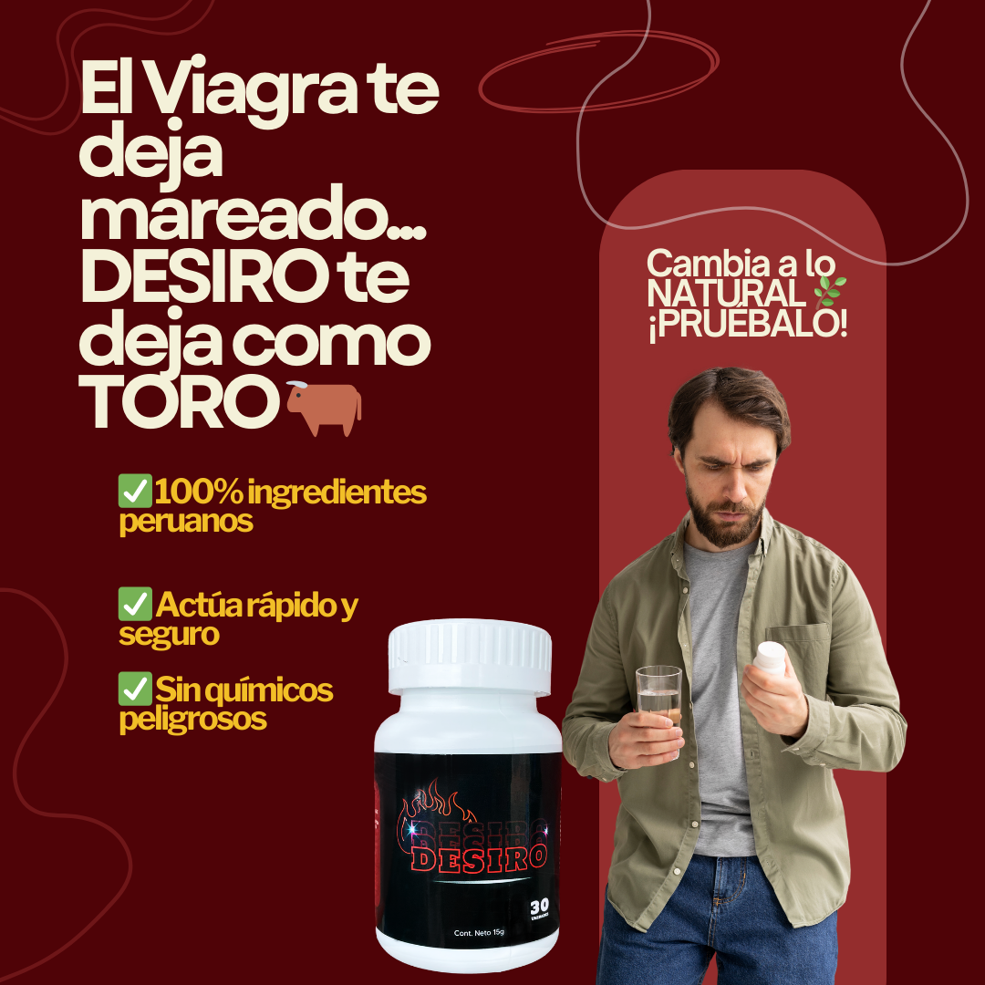 Desiro es el suplemento masculino diseñado para devolverle vitalidad, potencia y energía a tu vida íntima, ayudándote a sentirte nuevamente fuerte, seguro y en control.